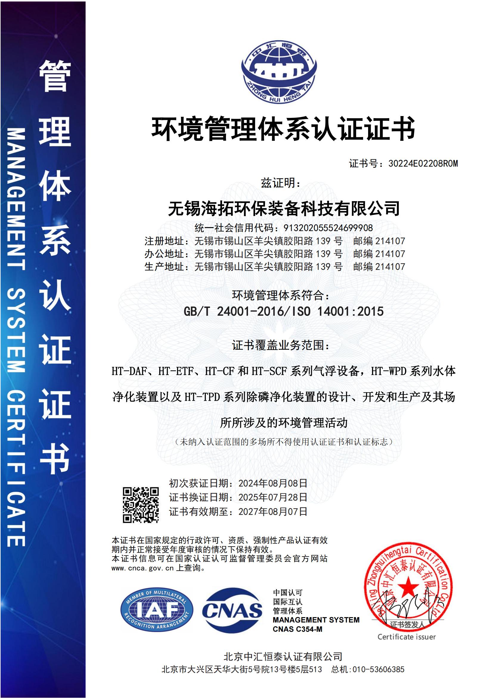 环境管理体系认证证书