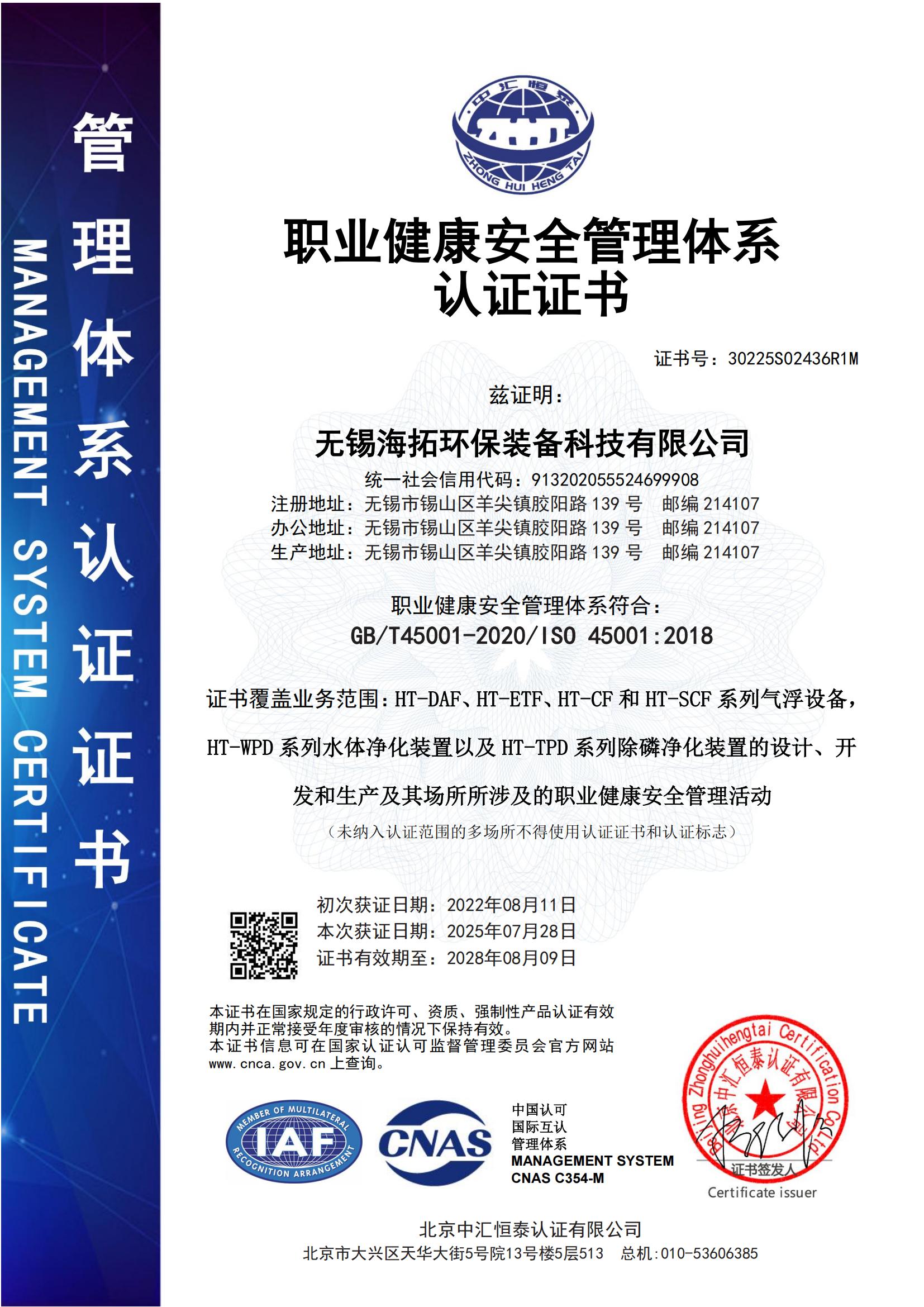 职业健康安全管理体系认证证书